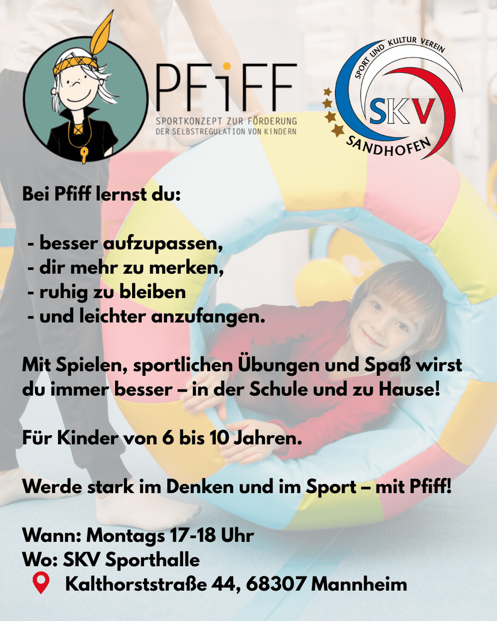 Der SKV Sandhofen bewegt wöchentlich über 500 Kinder und Jugendliche. Bewegung auf ca. 3.000 qm Sportinnenflächen und ca. 50.000 qm Sportaußenflächen.