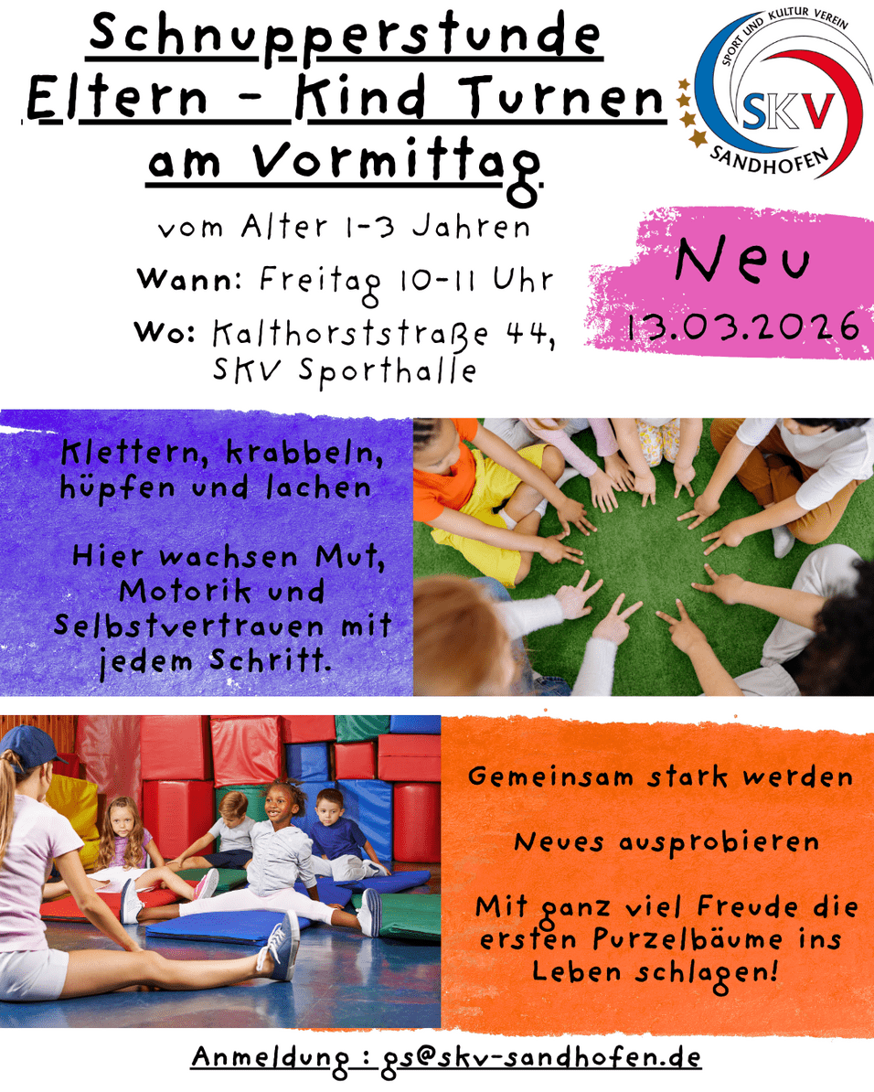 Klettern, krabbeln, hüpfen und lachen – in unserer Schnupperstunde entdecken Kinder von 1 bis 3 Jahren gemeinsam mit ihren Eltern die bunte Welt der Bewegung. Mit kleinen Abenteuern, spannenden Geräten und viel Raum zum Ausprobieren wächst nicht nur die Motorik, sondern auch Mut, Selbstvertrauen und die Freude an den ersten Purzelbäumen. Ob neugierige Entdecker oder kleine Wirbelwinde – hier findet jedes Kind seinen Platz.