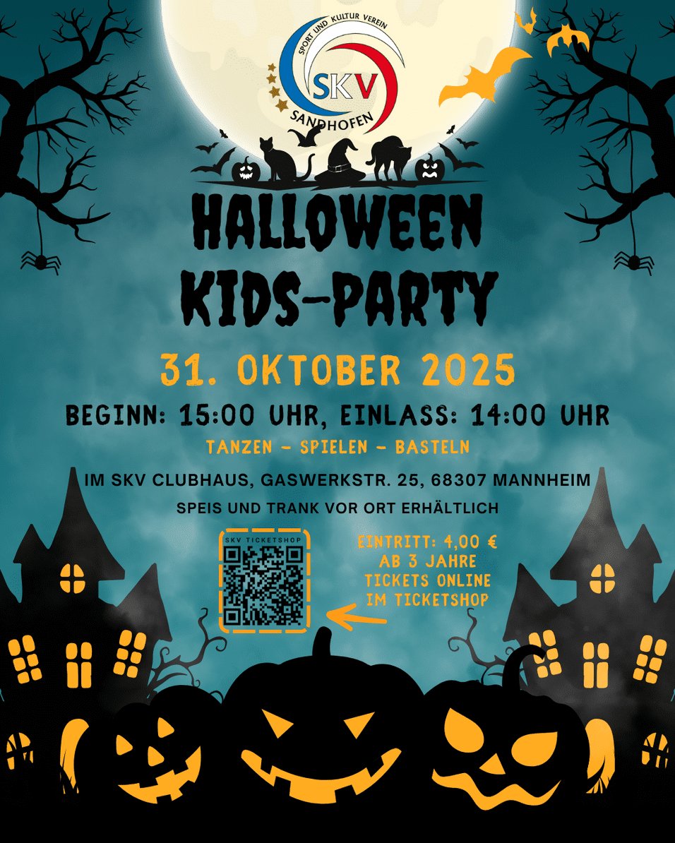 Es ist soweit: Die gruseligste Zeit des Jahres kehrt zurück! Und wir laden euch herzlich ein zu unserer Halloween Kids-Party am Freitag, den 31.10.2025 um 15 Uhr im SKV-Clubhaus! Freut euch auf schaurig-lustige Spiele und Tänze, gruselige Deko, kindgerechten Gruselspaß und natürlich jede Menge Süßes (oder Saures)! 🕸️🕷️ Natürlich verwöhnt uns das Clubhaus kulinarisch mit kindgerechten Speisen wie Chicken Nuggets, Schnitzel und Pommes.
