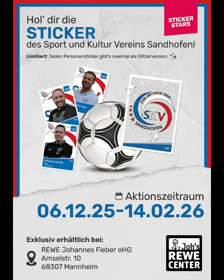 Ab dem 06. Dezember 2025 startet das große Stickerstars-Projekt des SKV Sandhofen! Sichere dir dein exklusives Stickeralbum und sammle die Stars unseres Vereins – von Spielern über Trainer bis hin zu echten Vereinshelden.