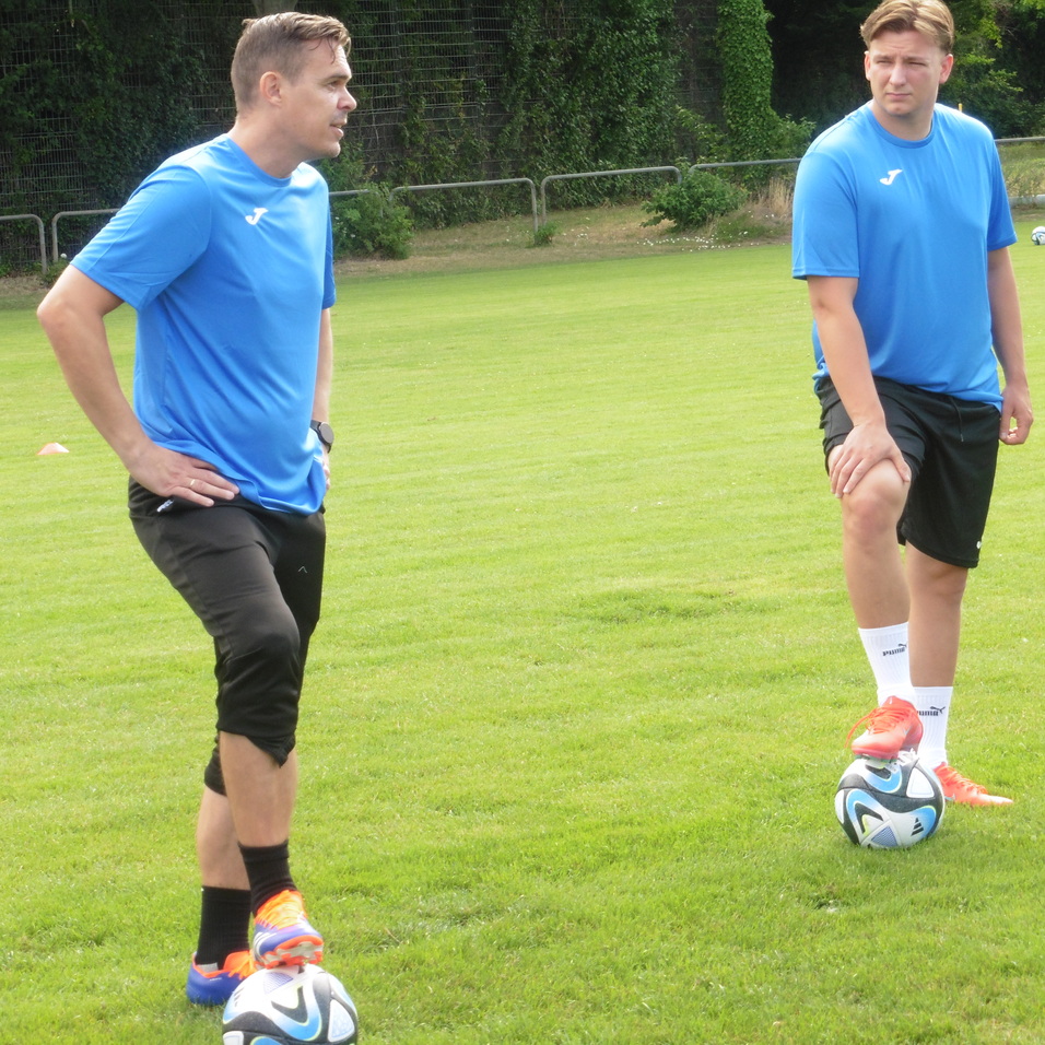 Am zweiten Juli-Sonntag ist die erste Mannschaft ins Training für die neue Saison 2025/2026 gestartet. Bei ziemlich hohen Temperaturen bat der wieder neu verpflichtete Coach Christian Hofsäß (Foto links) zur ersten Trainingseinheit auf das Sportgelände an der Gaswerkstraße. Bereits 21 Akteure fanden sich voller Vorfreude zum ersten Training ein. Erfreulich, dass nur zwei Spieler den Verein verließen und zwei Akteure die ihre aktive Laufbahn beendeten. Die aktuellen Neuzugänge werden auf einem Foto in Kürze vorgestellt. Die freundliche Begrüßung übernahm Fußball-Abt.Leiter. Holger Riffel, auf dem Trainingsplatz vor. Danach begrüßte auch Coach Hofsäß die Mannschaft und sprach klar und deutlich seine Erwartungen an das Team an. Vor allem wünscht sich der erfahrene Coach künftig eine große Trainingsbeteiligung, Ehrgeiz und Einsatzbereitschaft. Ihm zur Seite als Co-Trainer steht der bislang erfahrene Akteur, Sascha Weisel. Saisonziel ist und bleibt der Aufstieg in die Kreisliga, der leider in der letzten Saison verpasst wurde. Also ein neuer hoffnungsvoller Anlauf beim SKV Sandhofen. Der zunächst lockere Trainingsauftakt begann mit mehreren kurzen “Spielchen” und Laufeinheiten mit Unterbrechungen. Etwas ernster wurde es dann als zwei Teams gebildet wurden die gegeneinander spielten durften. Man merkte, dass es den Spielern viel Freude machte endlich, nach der mehrwöchigen Pause, wieder mit dem Ball spielen zu können.