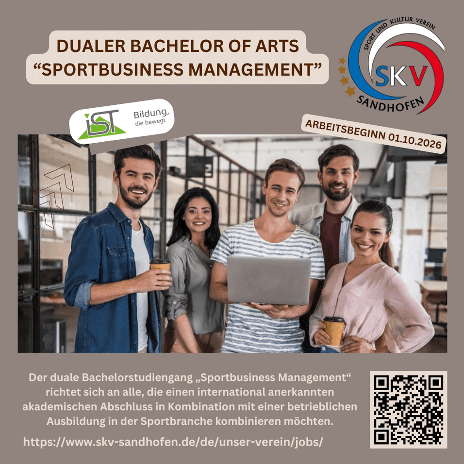 Der duale Bachelorstudiengang „Sportbusiness Management“ richtet sich an alle, die einen international anerkannten akademischen Abschluss in Kombination mit einer betrieblichen Ausbildung in der Sportbranche kombinieren möchten. Du lernst an der staatlich anerkannten IST-Hochschule für Management und sammelst gleichzeitig wertvolle Berufserfahrungen bei uns im Betrieb.